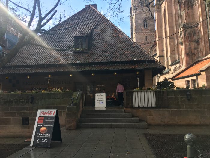 放完行李後我們就穿過 pegnitz river 內的 shopping area,直接往河外走去吃了紐倫堡的百年香腸店:Bratwursthäusle bei St. Sebald。