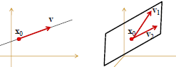 - 若 x0, v1 和 v2 為向量, 且 v1 和 v2 不共線, 則方程式 x = x0+t1v1 + t2v2 定義了”通過x0 且平行於v1,v2”的平面, 當x0 = 0 時, 該平面過原點